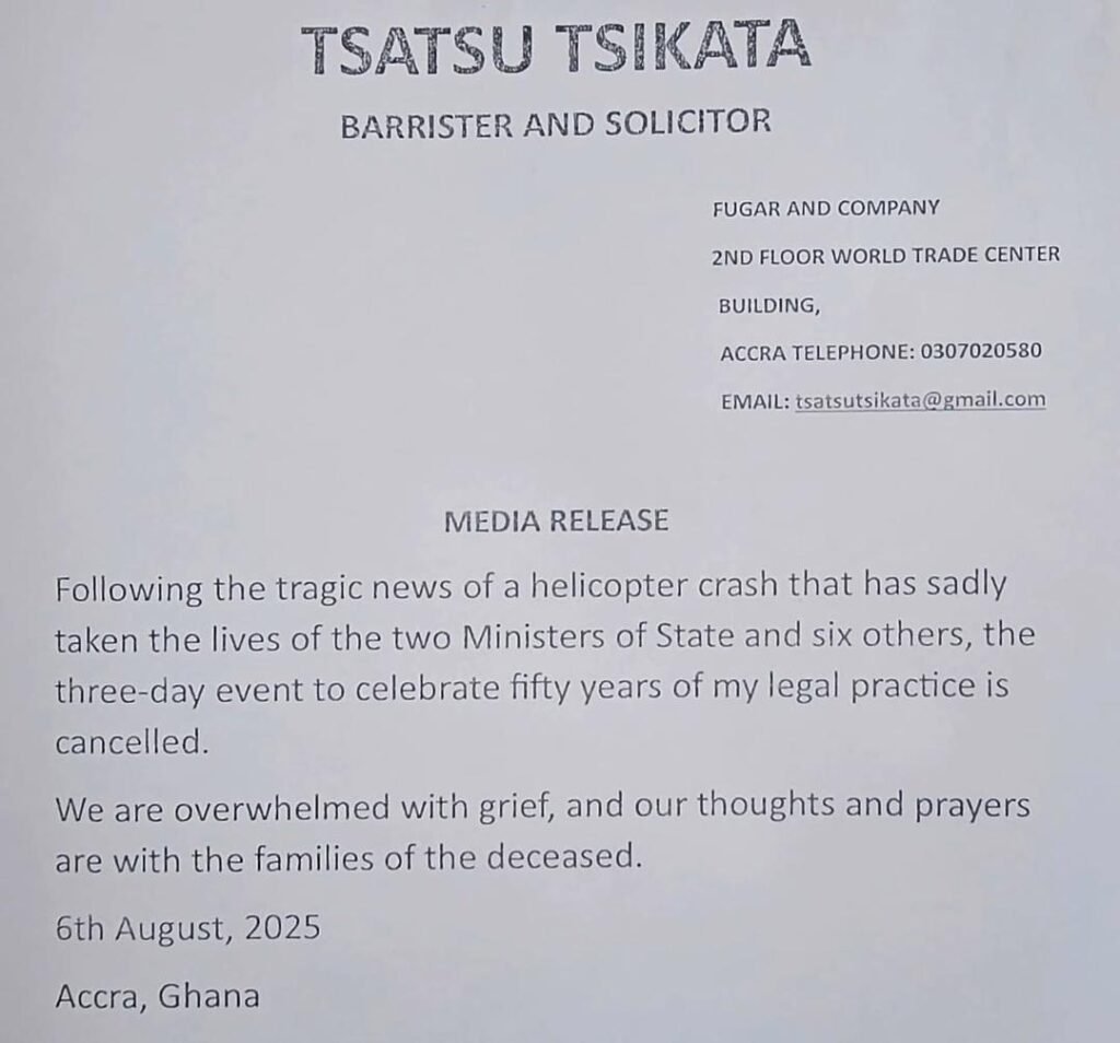 Renowned legal practitioner Tsatsu Tsikata has cancelled a planned three-day celebration to mark his 50 years of legal practice following the tragic helicopter crash that claimed the lives of two Ministers of State and six others.